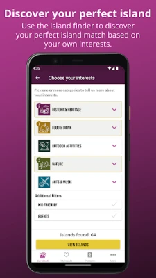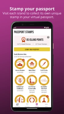 „Scottish Islands Passport" ako váš digitálny pas na zber ostrovných známok. Objavte 72 obývaných škótskych ostrovov, ich úchvatnú krajinu, komunity a bohatú kultúru. Získajte lokálne tipy na zážitky, od pláží po históriu, a nájdite si svoje ideálne dobrodružstvo s naším nástrojom na vyhľadávanie.
